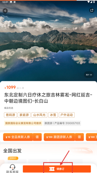 3、選擇東北定制六日療休之旅吉林霧凇-網(wǎng)紅延吉-中朝邊境圖們-長白山旅游產(chǎn)品條目,進入產(chǎn)品詳情頁面。