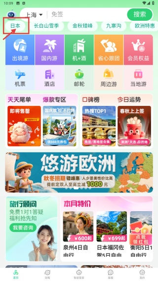 1、打開旅游服務類應用,點擊日本目的地分類,進入日本旅游產(chǎn)品頁面。
