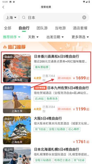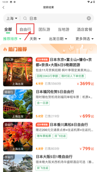 2、在日本旅游產(chǎn)品頁面,選擇自由行分類,進入自由行產(chǎn)品列表頁面。