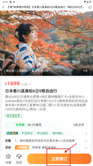 4、在詳情頁面,點擊立即預訂按鈕,進行旅游產(chǎn)品預訂操作。