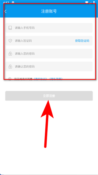 4、在依次輸入手機號碼、驗證碼、密碼等信息后,點擊立即注冊。