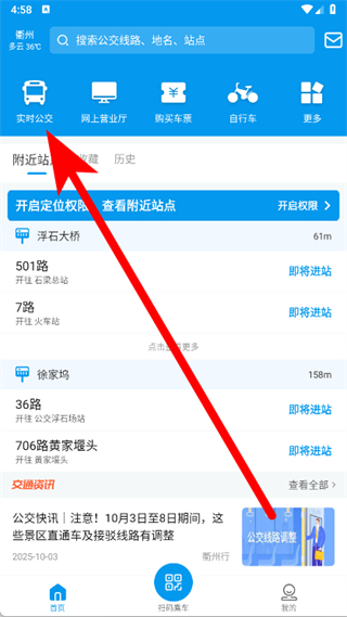 1、打開衢州行APP,點(diǎn)擊首頁實(shí)時(shí)公交。