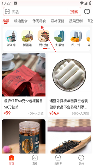 1、點(diǎn)擊頁面上方的休閑零食標(biāo)簽,進(jìn)入休閑零食分類頁面。