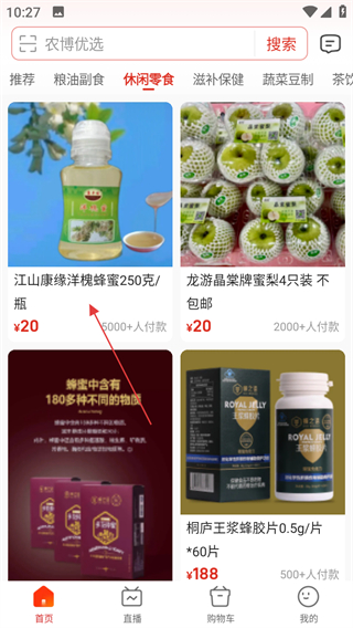 2、在休閑零食分類頁面,選擇喜歡的商品,進(jìn)入商品詳情頁面。