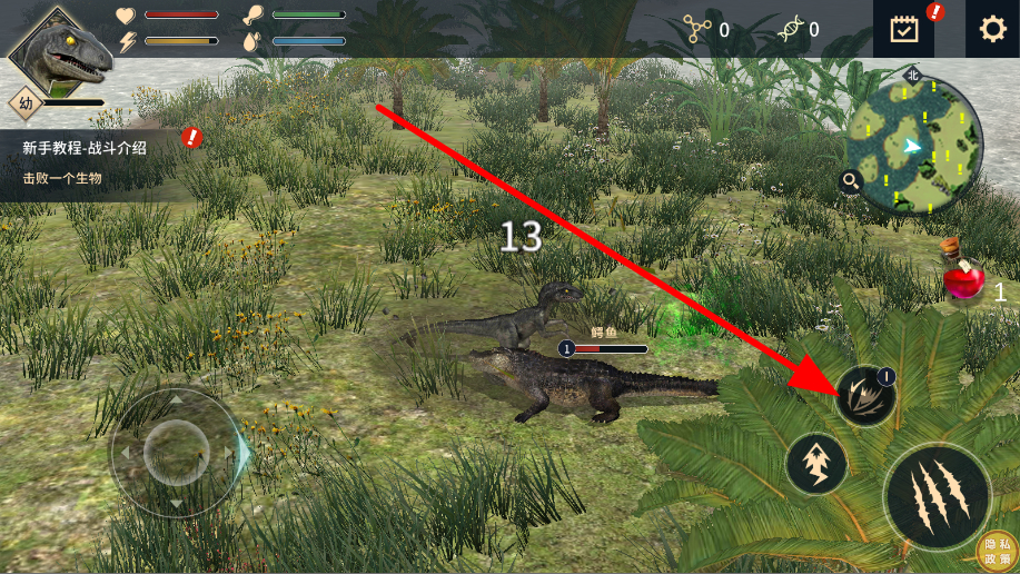 1、操控恐龍?jiān)趫?chǎng)景中移動(dòng),遇到目標(biāo)生物時(shí),點(diǎn)擊技能按鈕,使用技能對(duì)其發(fā)起攻擊,依靠技能效果嘗試擊敗生物,完成擊殺任務(wù)。