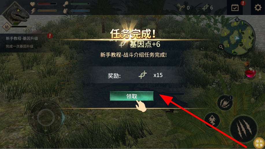 2、成功完成擊殺等任務(wù)后,會(huì)彈出任務(wù)完成界面,點(diǎn)擊領(lǐng)取按鈕,獲取基因點(diǎn)等獎(jiǎng)勵(lì),這些獎(jiǎng)勵(lì)可用于后續(xù)恐龍的強(qiáng)化與進(jìn)化。