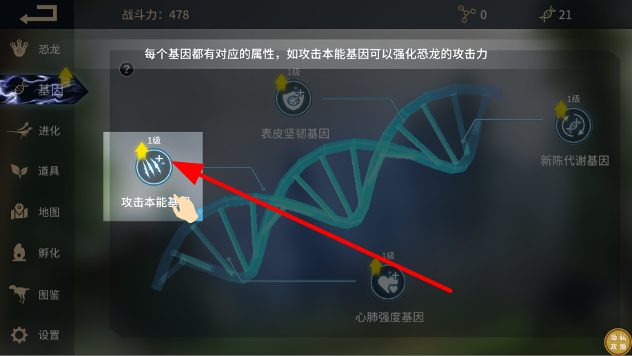 3、進(jìn)入基因界面,選擇對(duì)應(yīng)的基因,如攻擊本能基因,對(duì)其進(jìn)行強(qiáng)化,以此提升恐龍的攻擊力等屬性,讓恐龍?jiān)趹?zhàn)斗中更具優(yōu)勢(shì)。