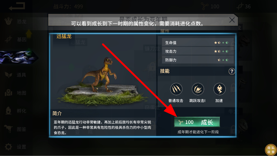 4、當(dāng)滿足進(jìn)化條件時(shí),消耗進(jìn)化點(diǎn)數(shù),點(diǎn)擊成長(zhǎng)按鈕,讓恐龍進(jìn)化成長(zhǎng)到下一時(shí)期,進(jìn)化后恐龍的生命值、攻擊力等屬性會(huì)得到提升。
