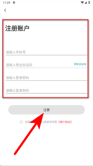 4、輸入手機號、短信驗證碼、登錄密碼、確認登錄密碼,勾選同意后,點擊注冊。