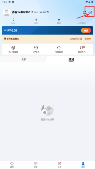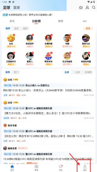 1、打開體育資訊類應(yīng)用,點擊底部我的選項,進入個人中心頁面。