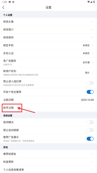 3、在設(shè)置頁面,點擊賬號注銷選項,進入賬號注銷頁面。