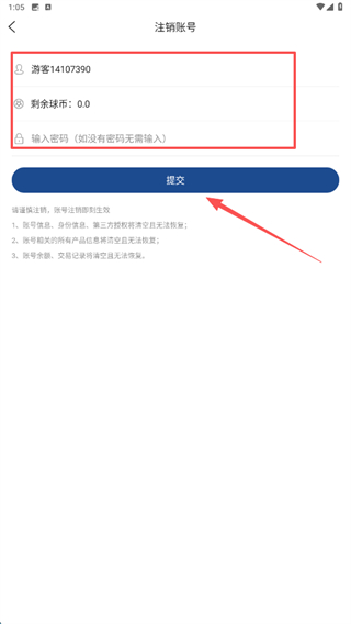 4、確認賬號信息后,輸入密碼如無密碼可跳過,點擊提交按鈕,完成賬號注銷操作。