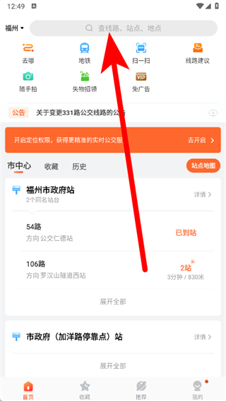 1、打開(kāi)掌上公交,點(diǎn)擊頂部查線路、站點(diǎn)、地點(diǎn)的搜索框。