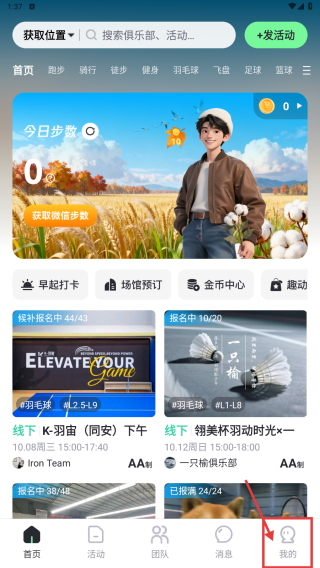 1、打開(kāi)運(yùn)動(dòng)社交類應(yīng)用,點(diǎn)擊底部我的選項(xiàng),進(jìn)入個(gè)人中心頁(yè)面。