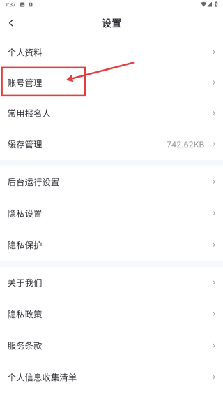 3、在設(shè)置頁(yè)面,點(diǎn)擊賬號(hào)管理選項(xiàng),進(jìn)入賬號(hào)管理界面。