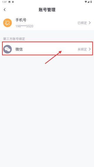4、在賬號(hào)管理界面,點(diǎn)擊微信未綁定選項(xiàng),進(jìn)行微信賬號(hào)綁定操作。