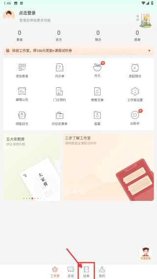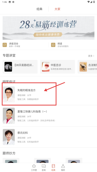 1、打開中醫(yī)學(xué)習(xí)類應(yīng)用,點擊底部經(jīng)典選項,進(jìn)入經(jīng)典課程頁面。