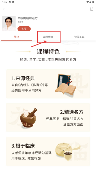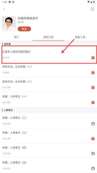 2、在經(jīng)典課程頁面,選擇失眠的精準(zhǔn)選方課程條目,進(jìn)入課程詳情頁面。