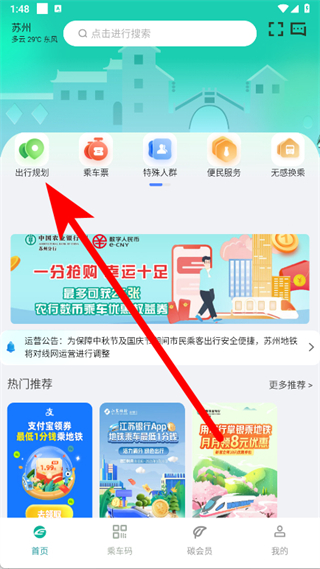 1、打開蘇e行APP,點(diǎn)擊首頁出行規(guī)劃。