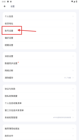 3、在設(shè)置頁面,點(diǎn)擊賬號設(shè)置選項(xiàng),進(jìn)入賬號設(shè)置界面。