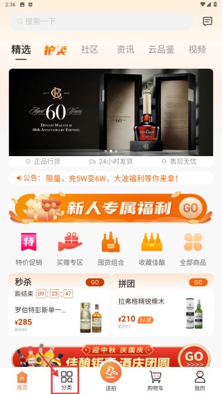 1、打開酒類電商應用,點擊底部分類選項,進入商品分類頁面。