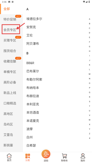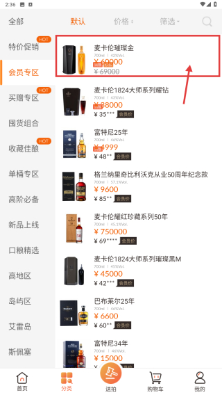 2、在分類頁面,選擇會員專區(qū)分類,進入會員專屬商品列表頁面。