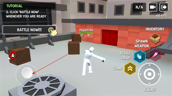 1、進入游戲教程,通過屏幕左下方虛擬搖桿移動角色,準備好后點擊BATTLENOW!!!按鈕開始戰(zhàn)斗。
