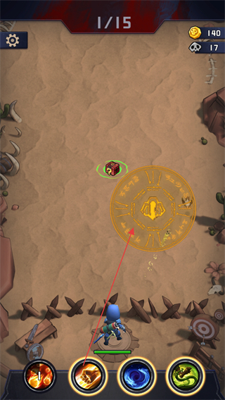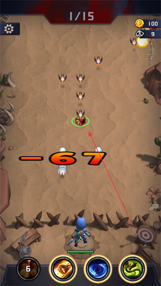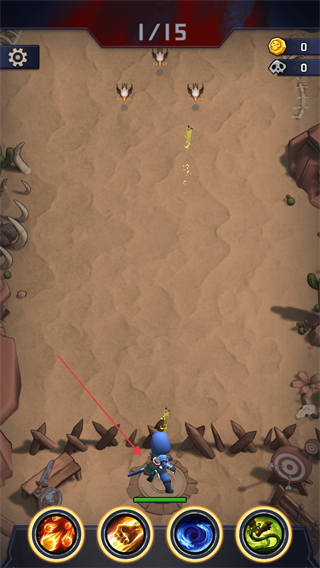 1、進(jìn)入游戲關(guān)卡,屏幕上方顯示1/15代表關(guān)卡進(jìn)度,點(diǎn)擊下方技能按鈕攻擊前方怪物。