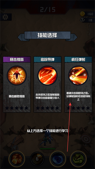 4、每完成一定階段戰(zhàn)斗,會(huì)彈出技能選擇界面,從如暴擊提高,追蹤導(dǎo)彈等技能中選擇,提升角色實(shí)力。