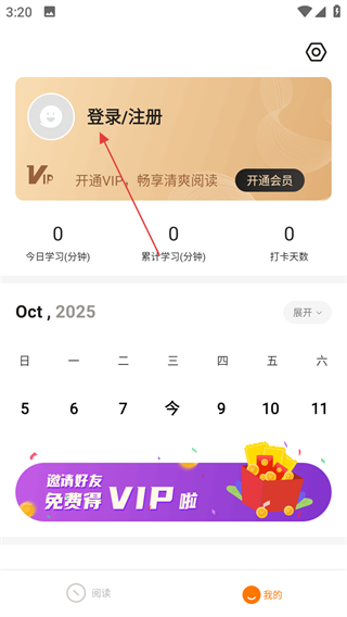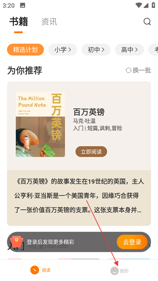 1、進(jìn)入蘿卜閱讀首頁,點(diǎn)擊右下角我的,進(jìn)入個人中心頁面。
