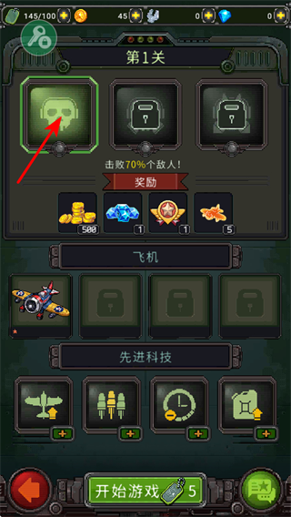 1、選擇第1關(guān),該關(guān)卡目標(biāo)為擊敗70%的敵人,完成后可獲得金幣、鉆石等獎(jiǎng)勵(lì),開啟游戲基礎(chǔ)關(guān)卡。