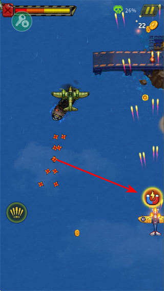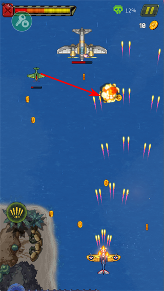 3、攻擊敵方飛機(jī),通過射擊消滅敵方單位,積累擊殺數(shù)以完成關(guān)卡目標(biāo),同時(shí)可獲取金幣資源。