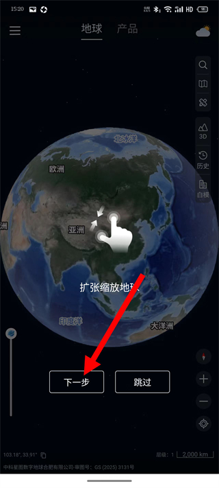 3、學(xué)習(xí)擴(kuò)張縮放地球的引導(dǎo)頁,點(diǎn)擊下一步。