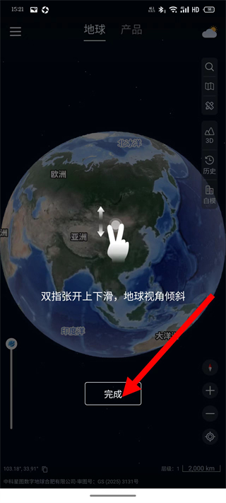 4、學(xué)習(xí)雙指張開上下滑,地球視角傾斜后,點(diǎn)擊完成,結(jié)束新手引導(dǎo)并開始探索。