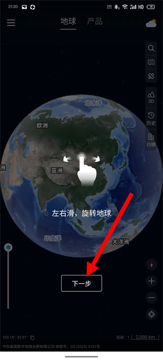2、學(xué)習(xí)左右滑,旋轉(zhuǎn)地球的引導(dǎo)頁,點(diǎn)擊下一步。