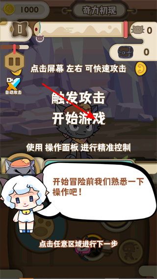 1、點擊開始游戲,進入冒險關(guān)卡奇力初現(xiàn),開啟游戲進程,熟悉著操作和戰(zhàn)斗的機制。