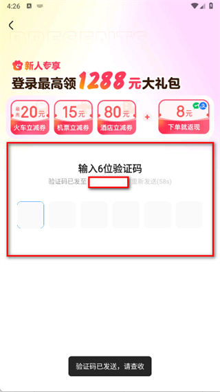 4、在驗(yàn)證碼輸入頁面,填寫收到的6位驗(yàn)證碼完成注冊登錄。