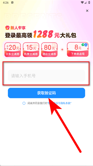 3、輸入手機(jī)號,勾選后,點(diǎn)擊獲取驗(yàn)證碼。
