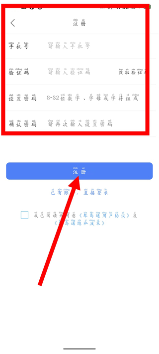 4、依次輸入手機(jī)號(hào)、驗(yàn)證碼、設(shè)置密碼、確認(rèn)密碼,勾選后,點(diǎn)擊注冊(cè)完成賬號(hào)注冊(cè)。