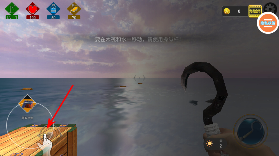 1、點(diǎn)擊獲取補(bǔ)給區(qū)域,收集木筏上的初始的資源,這是生存的基礎(chǔ),可以用于后續(xù)制作和升級(jí)。