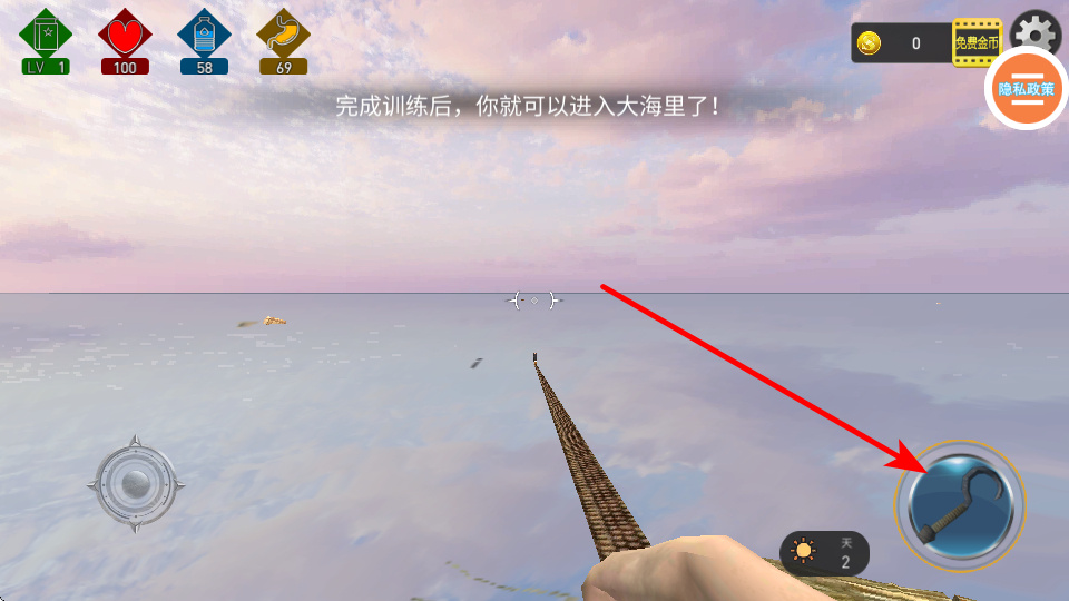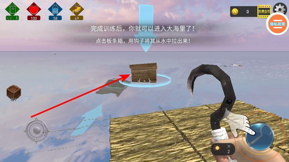 2、使用工具,通過(guò)點(diǎn)擊右側(cè)鉤子按鈕,向遠(yuǎn)處發(fā)射鉤子,勾取水中的資源或板條箱,獲取物資。