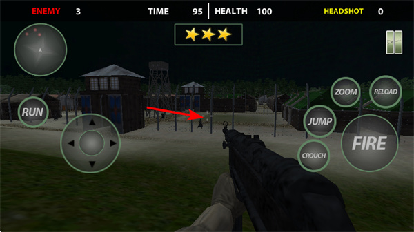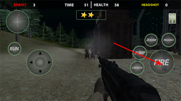 4、合理運(yùn)用射擊操作,針對(duì)不同場(chǎng)景下的敵人,及時(shí)觸發(fā)FIRE射擊,完成擊殺任務(wù)。