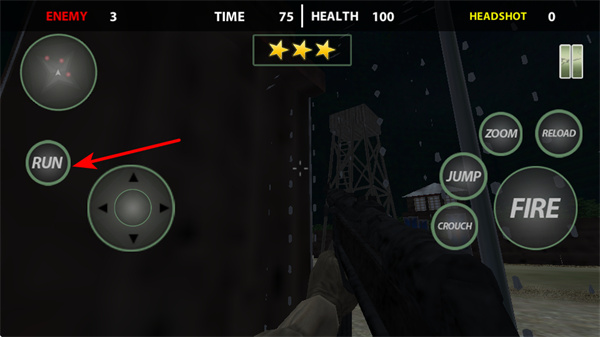 3、在遭遇敵人攻擊時(shí),可點(diǎn)擊RUN按鍵快速移動(dòng),通過(guò)奔跑躲避傷害,保障安全。