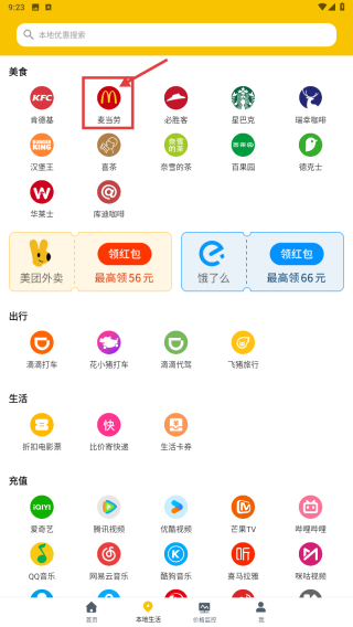 2、在本地生活頁(yè)面,選擇麥當(dāng)勞分類,進(jìn)入麥當(dāng)勞服務(wù)頁(yè)面。