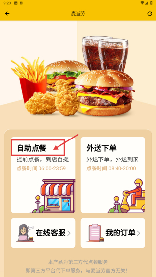3、在麥當(dāng)勞服務(wù)頁(yè)面,點(diǎn)擊自助點(diǎn)餐選項(xiàng),進(jìn)入選擇餐廳頁(yè)面。