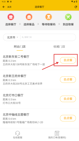 4、選擇北京新東安二號(hào)餐廳,點(diǎn)擊去點(diǎn)餐按鈕,進(jìn)行點(diǎn)餐操作。