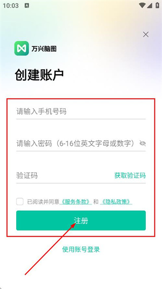 4、在創(chuàng)建賬戶頁面,填寫手機(jī)號(hào)碼、密碼、驗(yàn)證碼,點(diǎn)擊注冊,完成賬戶創(chuàng)建。