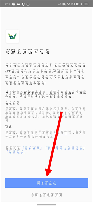 1、打開APP,在權(quán)限說(shuō)明頁(yè)面,點(diǎn)擊同意并繼續(xù)。