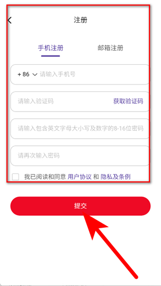 4、選擇手機(jī)注冊方式,依次輸入手機(jī)號、獲取并填寫驗(yàn)證碼,勾選后,點(diǎn)擊提交完成注冊。