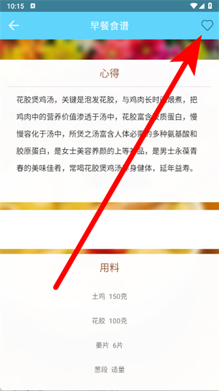 4、進入食譜詳情頁后,查看用料、做法等內(nèi)容,點擊右上角心形圖標(biāo)可收藏該食譜。